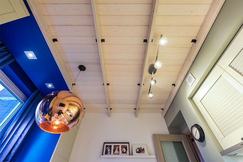 The warm shade of the wood above the room will envelop it with coziness, besides, it is easy to place several light sources in the ceiling slats.