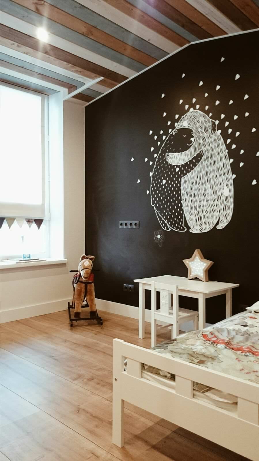 The use of environmentally friendly materials is especially important for children, which is why wood panels come first here. In addition, its variability and ease of processing allows you to create whimsical drawings on the walls and ceiling, which is a bonus in the design of the nursery.