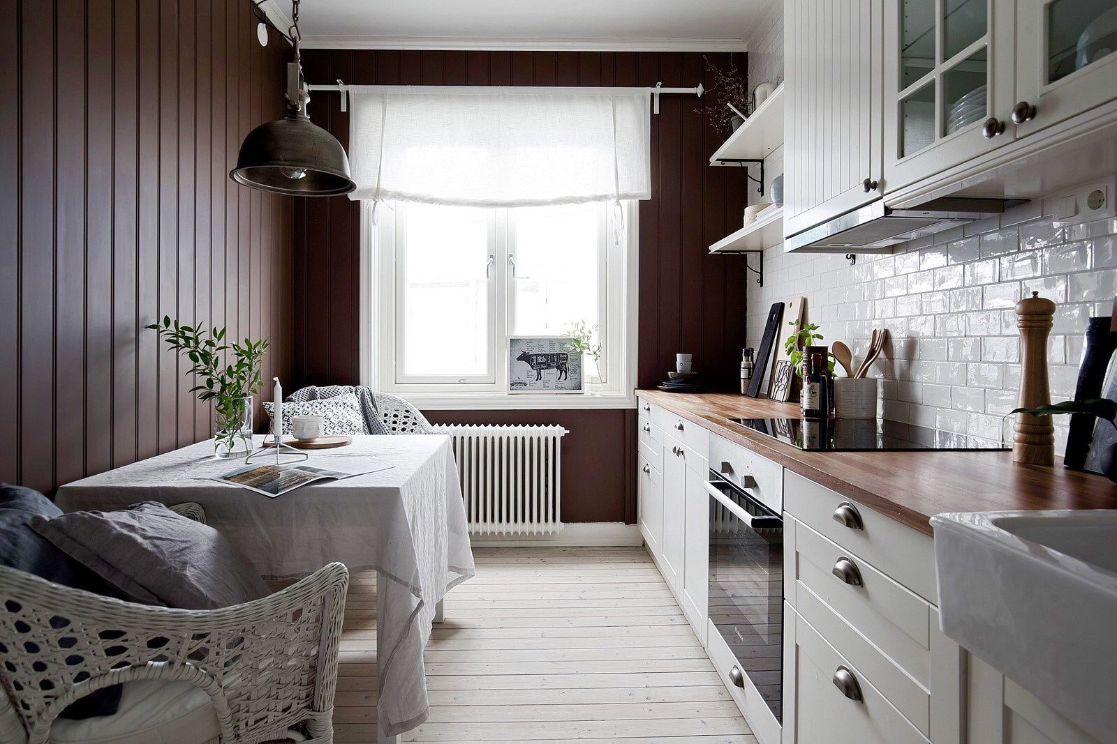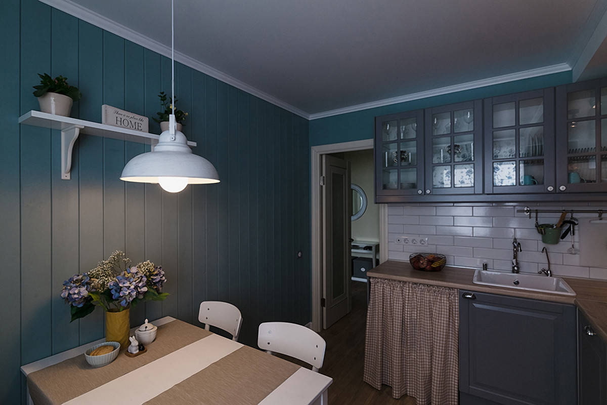 When covering the walls from floor to ceiling, separately protect the apron - in this area it is better to use more suitable materials (tiles, panels). In a Provence style kitchen, it will be appropriate to combine boards with wallpaper, for a loft - with brick, scandi - with painted walls.