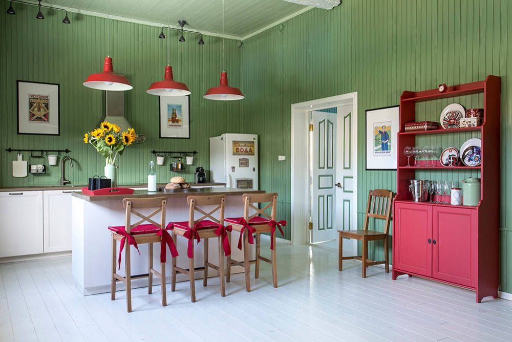 - Modern.Lining in a modern interior is painted in muted, dusty shades - blue, pink, mustard, emerald.