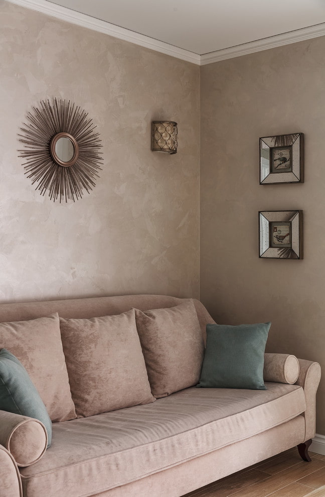 With this unique wall decoration with a special structural character, you can achieve a variety of effects on ceilings or walls. For the living room, classic plaster, silk, velvet, concrete or travertino surface is suitable.