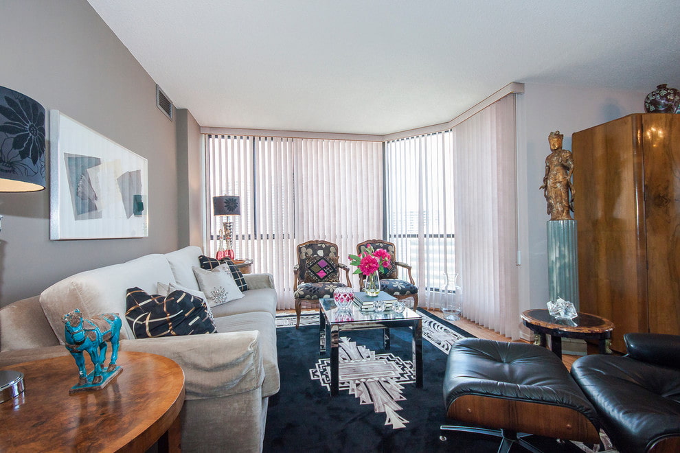 In the photo there is a fusion-style living room and light vertical blinds on the windows.