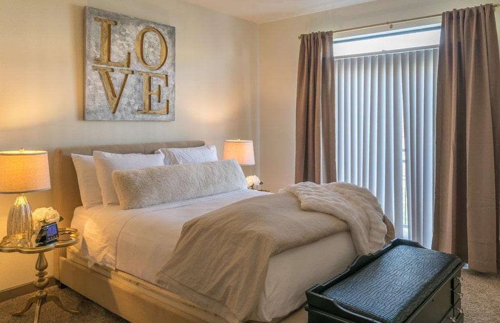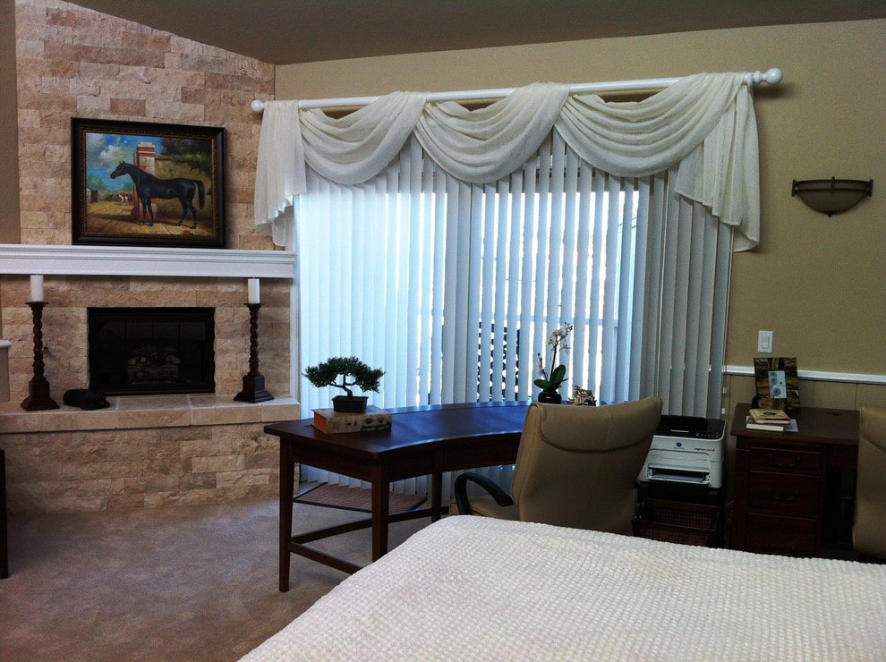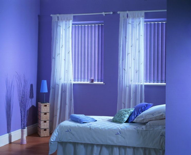 The photo shows a combination of vertical slats with a veil on the windows in the bedroom.