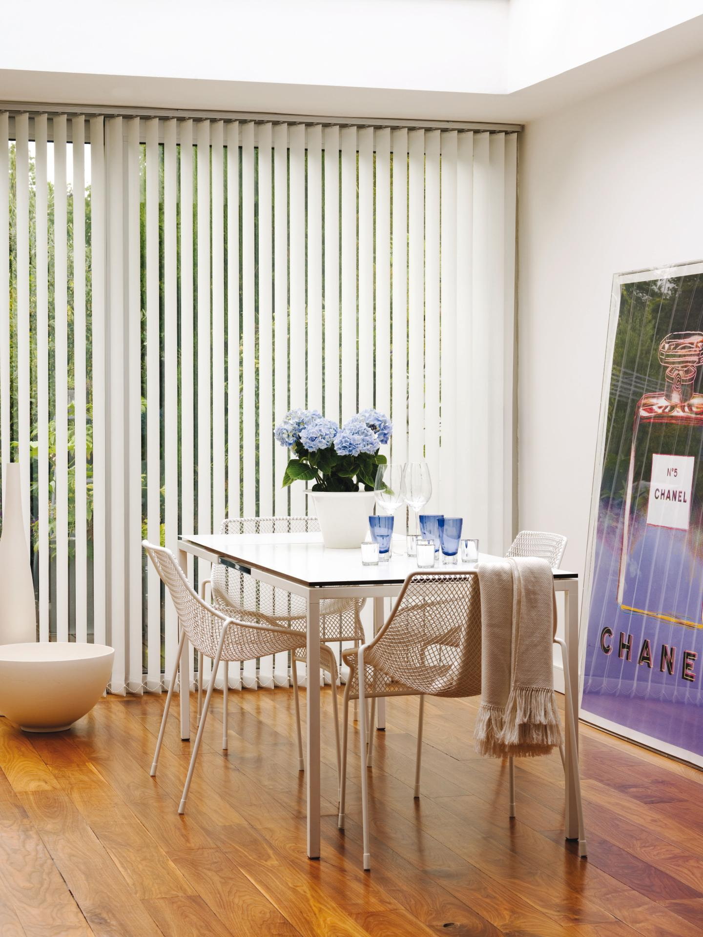 Vertical slats, located along the entire length of the balcony plastic window, look like one continuous canvas and thereby add integrity to the entire space.
