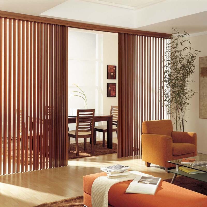 In the photo there are vertical slats in the form of a partition for zoning the space of the room.