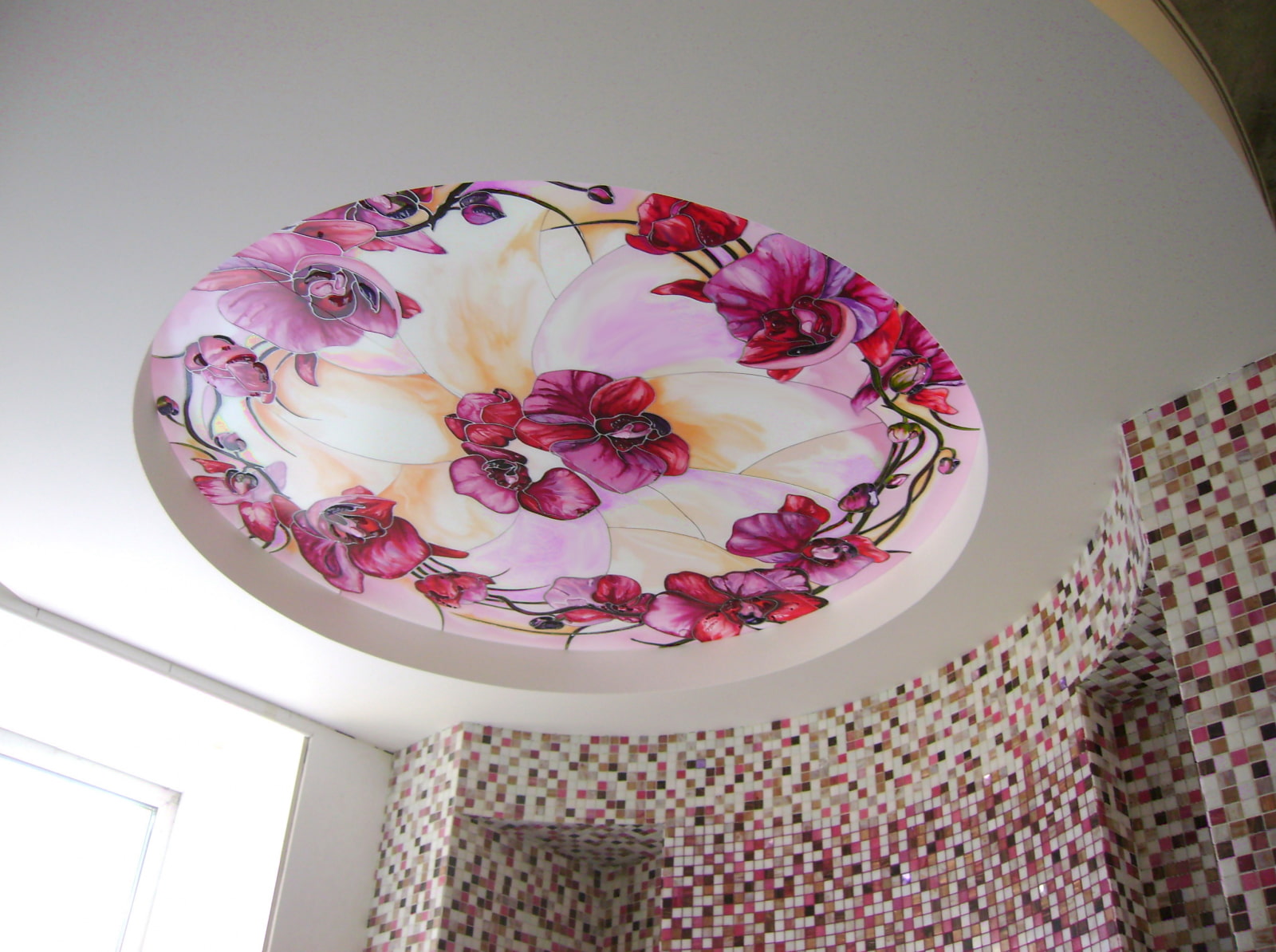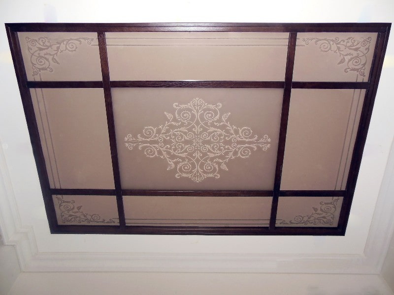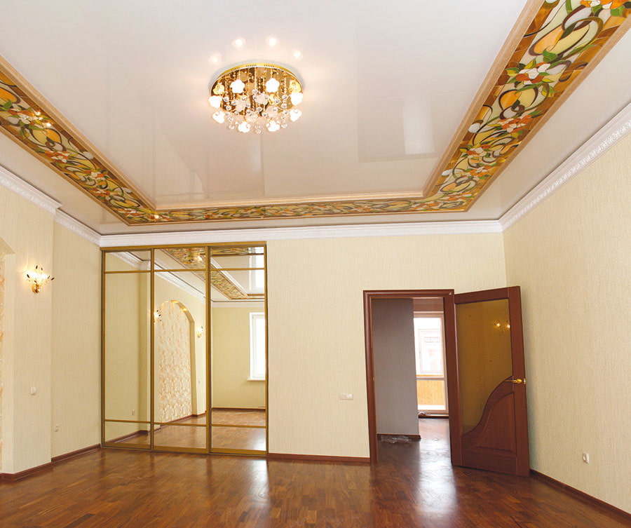 With the help of acrylic painting and a pattern applied to the ceiling plane, an imitation of a stained-glass window is created. This type has a special visual appeal.