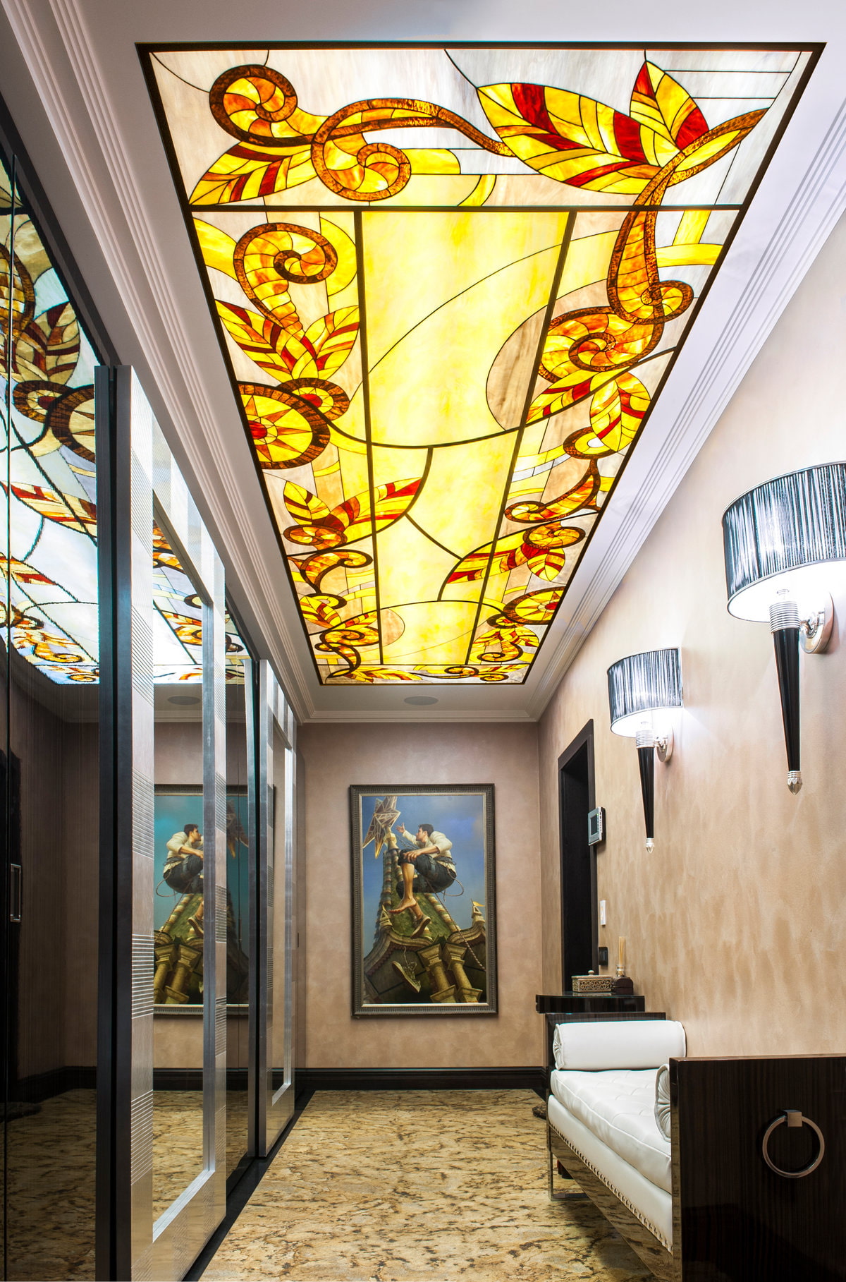 The stained glass ceiling is a delicate and very elegant decor. It brings a warm and mysterious atmosphere of coziness to the room, emphasizes the refined taste and just perfectly decorates and transforms the entire interior.