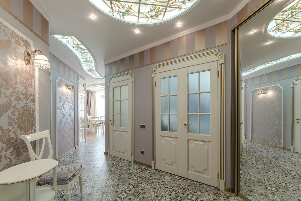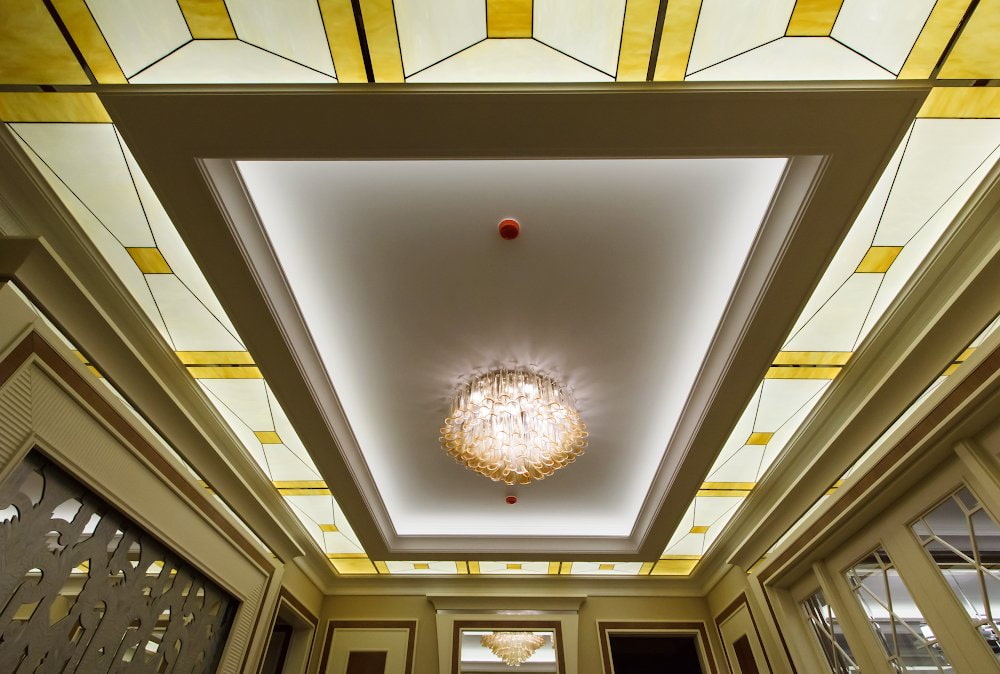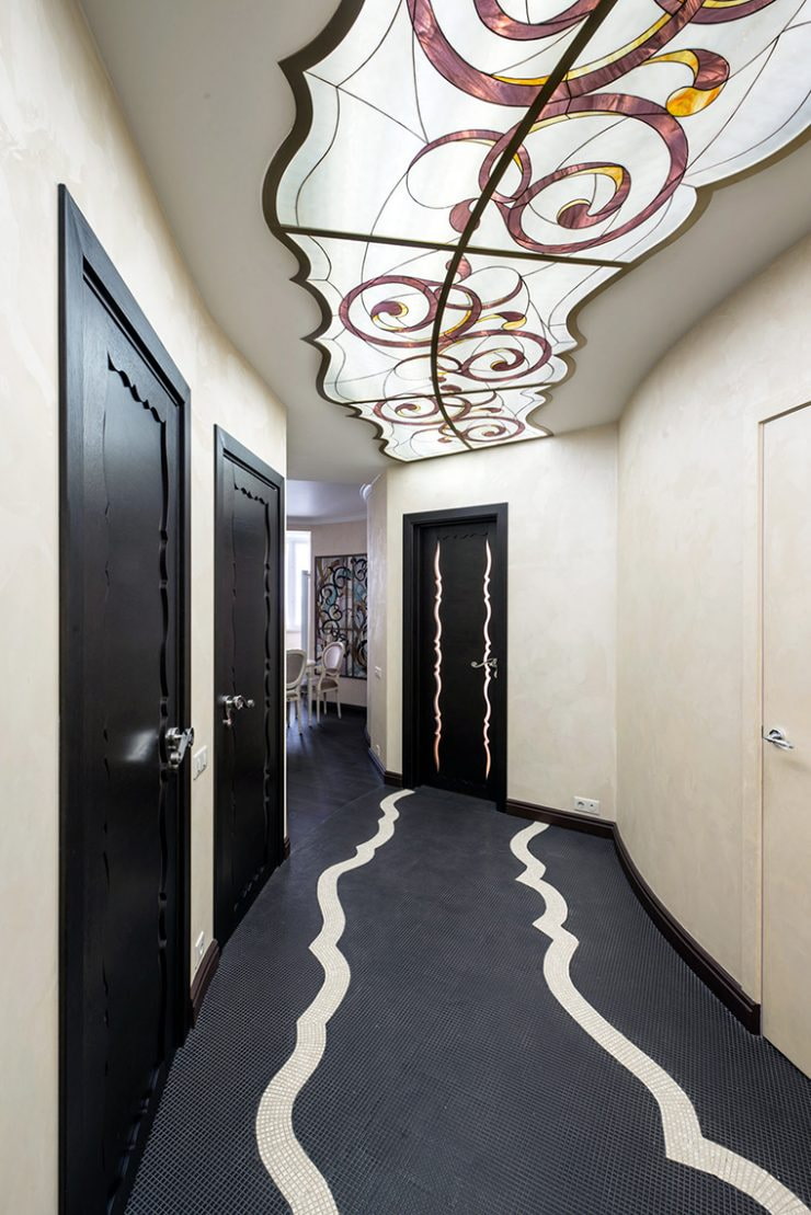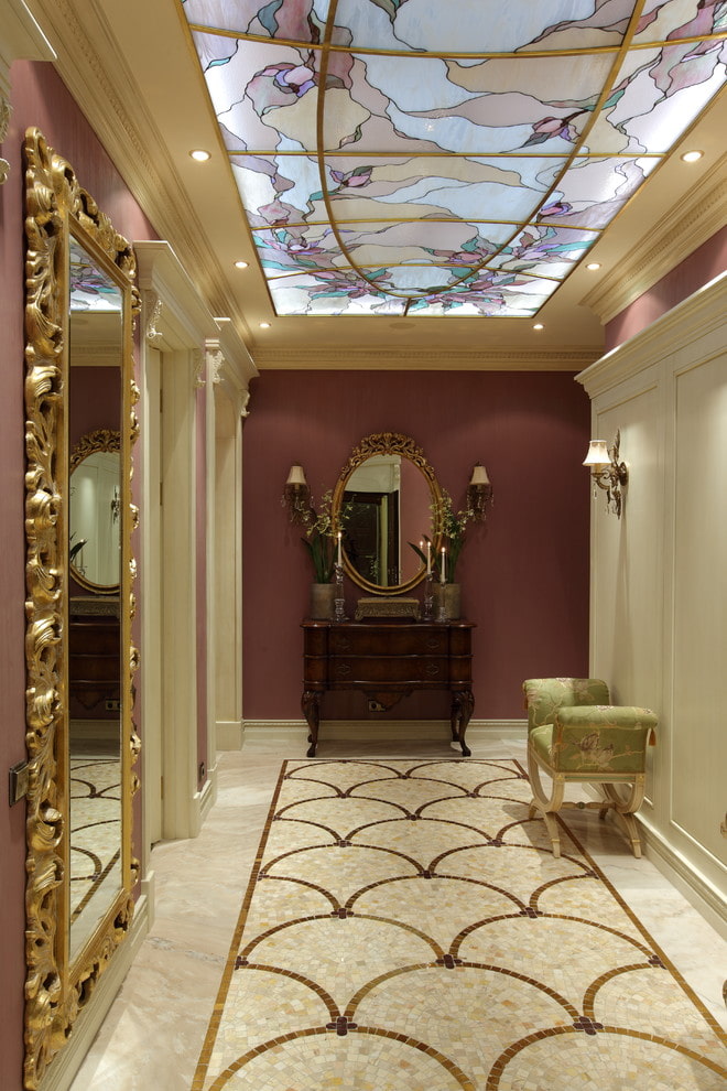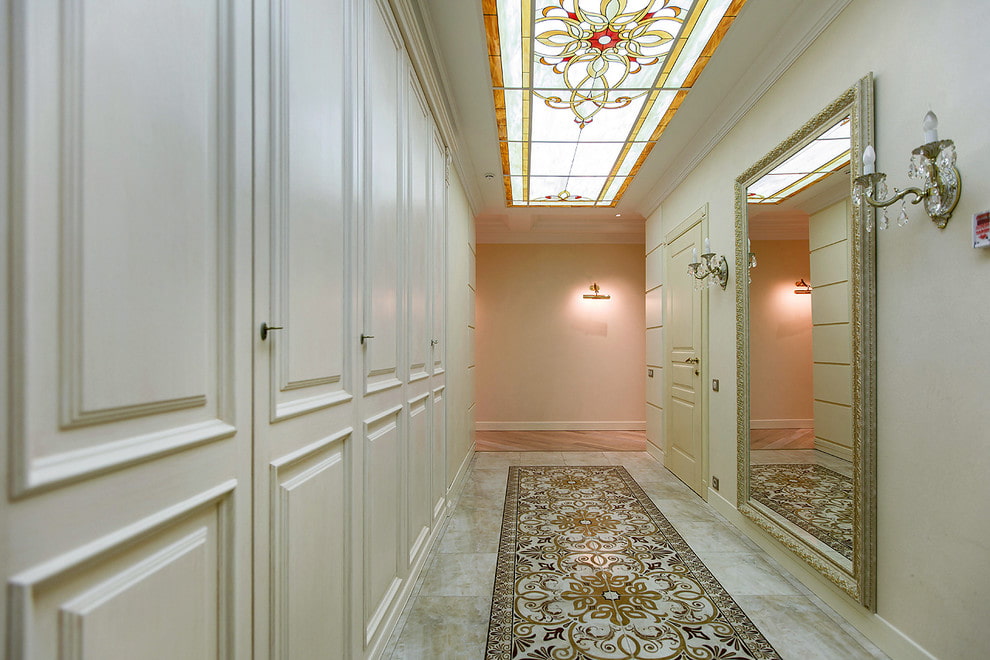 In the photo there is a stained glass cassette ceiling in the interior of the hallway.