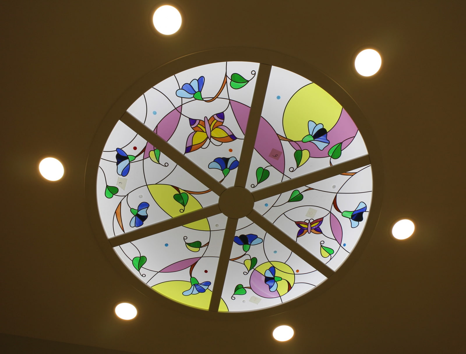 In the photo there is a stained glass insert located along the perimeter of the ceiling.