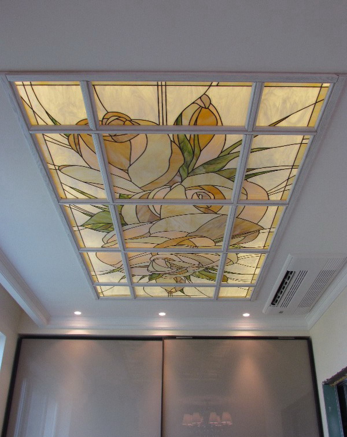 - Stained glass, located along the entire ceiling plane, is more suitable for spacious rooms, and for small ones, a partial arrangement of inserts will be appropriate.