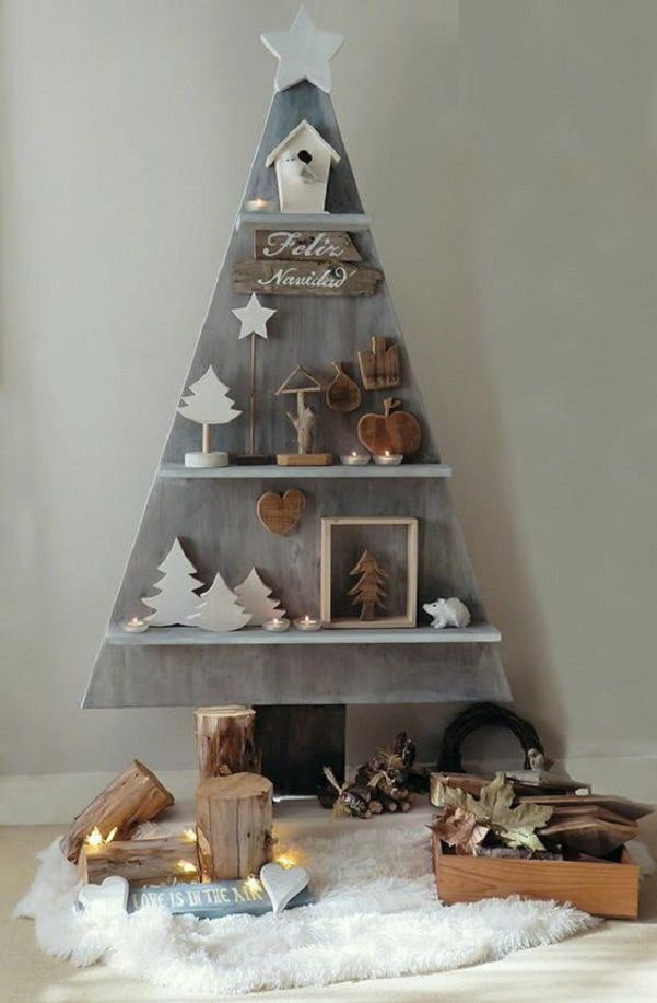 Long wooden slats can be connected from above and used as a frame for hanging balls. And if you use a jigsaw and self-tapping screws, a stylish Christmas tree made of thin bars and slats will become the main decoration of the house.