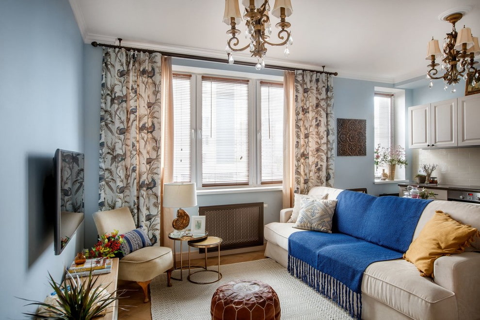 If you think that blinds are more suitable for offices, complement them with curtains - this option looks more original than traditional tulle.