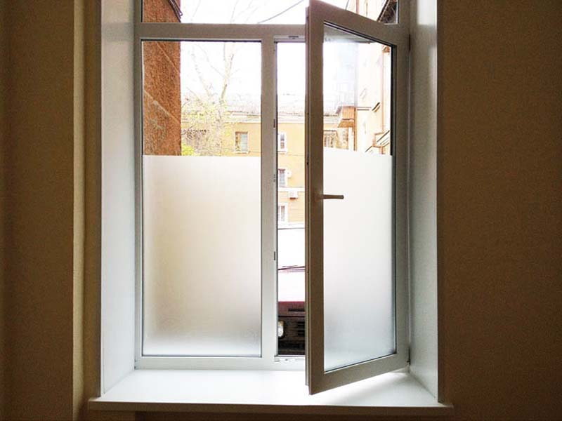 To fix the material, dampen it with water and apply it to the glass. The film will adhere reliably if all air bubbles are carefully expelled. It will reliably protect from the prying eyes of passers-by, provide sufficient lighting and leave no traces after removal.