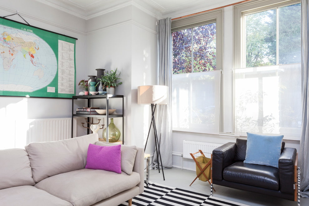 An even more interesting solution for creating coziness in the apartment is the curtains, reminiscent of the window decoration in a train carriage. They are fixed in the center of the window opening and cover its lower half, leaving access to sunlight.