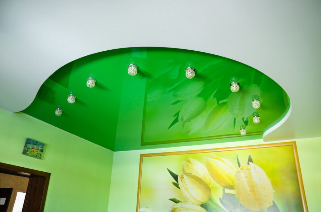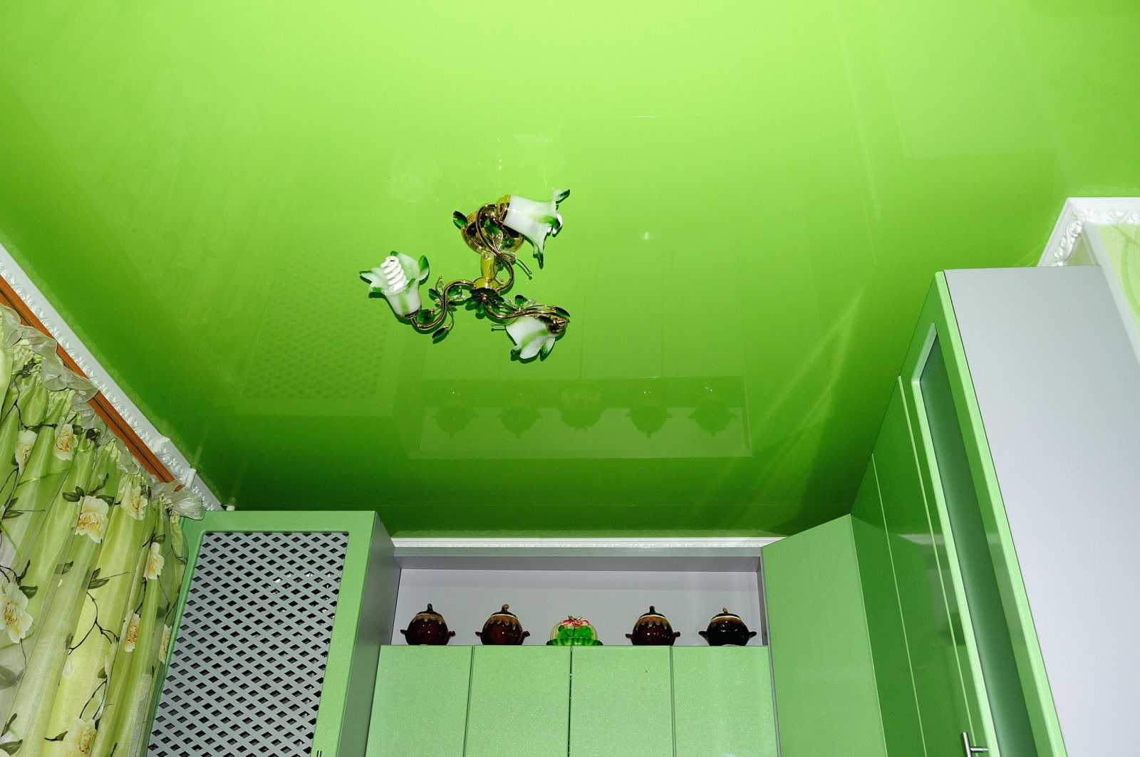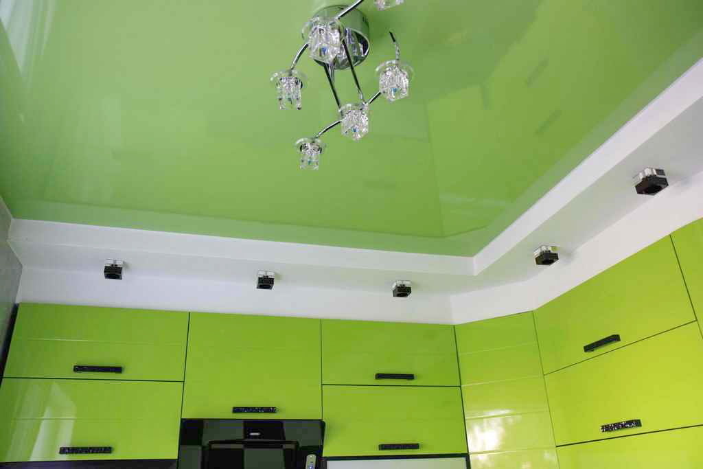 The photo shows a glossy green stretch ceiling in the kitchen.