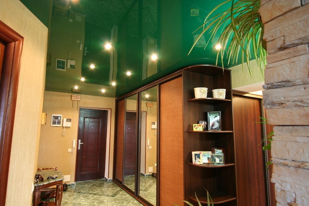 A dark glossy stretch canvas or ceiling tile, in combination with correctly selected lighting, will give the hallway or corridor an unusual and unexpected appearance.
