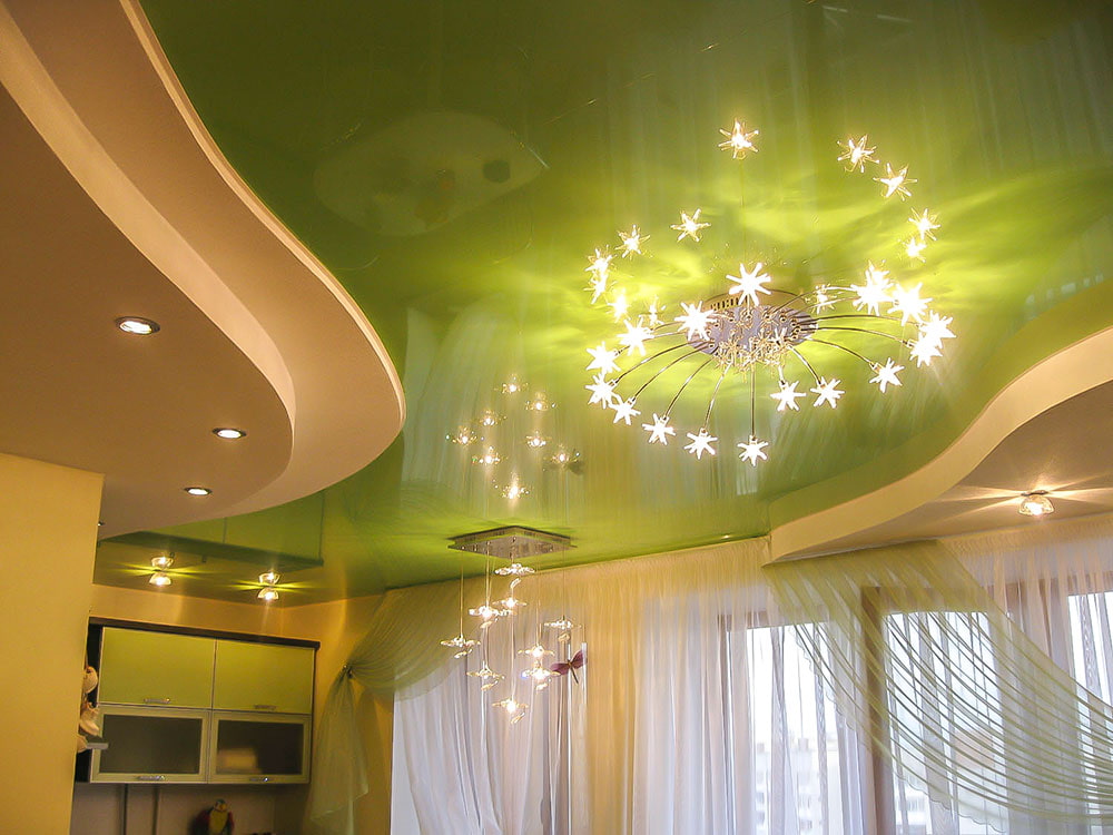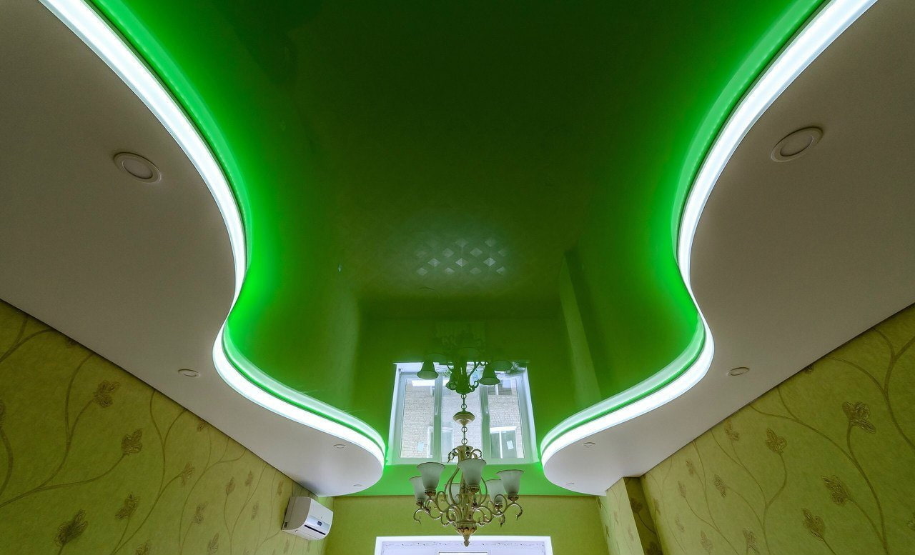 In the photo there is a spacious living room with a stretch green glossy ceiling.