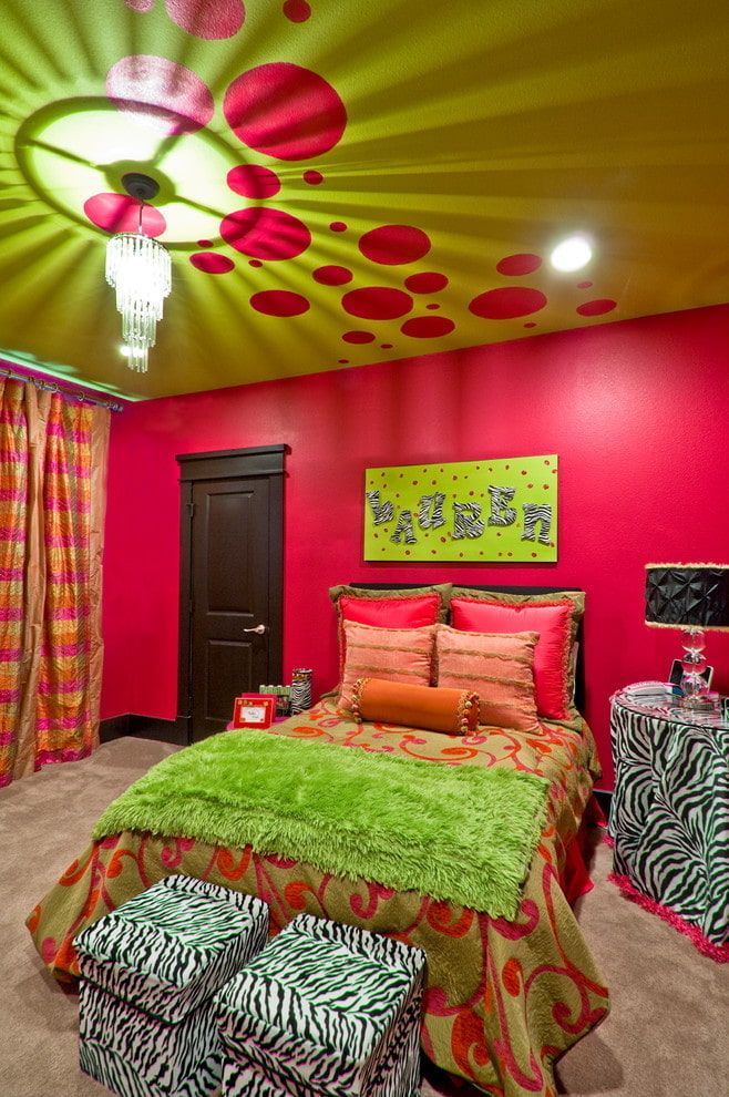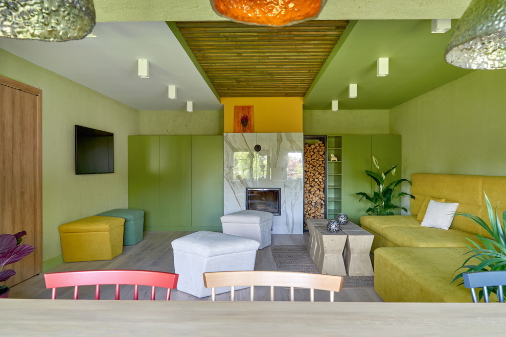 The ceiling structure in this range will undoubtedly become the brightest and most effective accent of the room. Red looks a little aggressive, while green gives it a calm and special appeal.