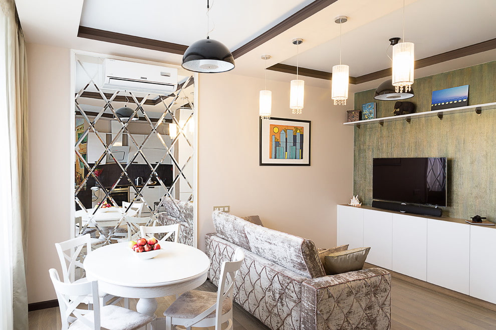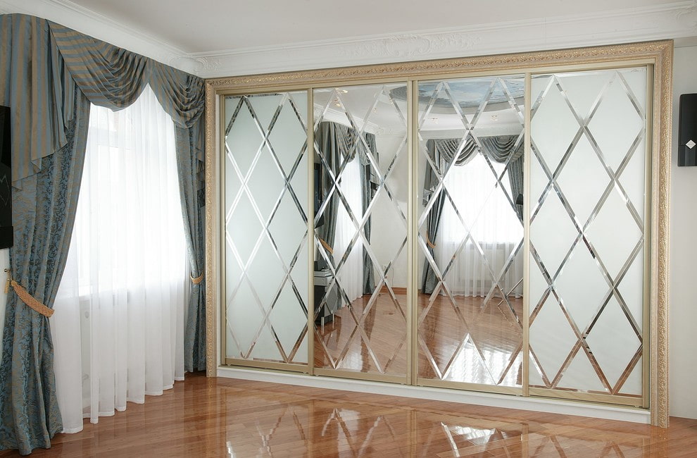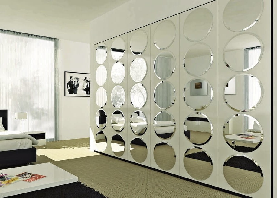 - Built into furniture. The faceted mirror surface built into the furniture allows not only to radically transform the space and create an original and sophisticated design, but is also a very convenient and practical interior solution.