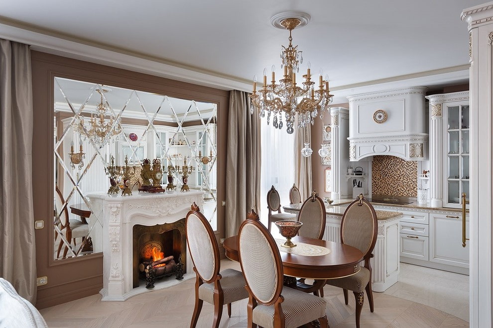 In the photo there are narrow mirrors with a facet in the form of squares in the interior of a classic dining room.