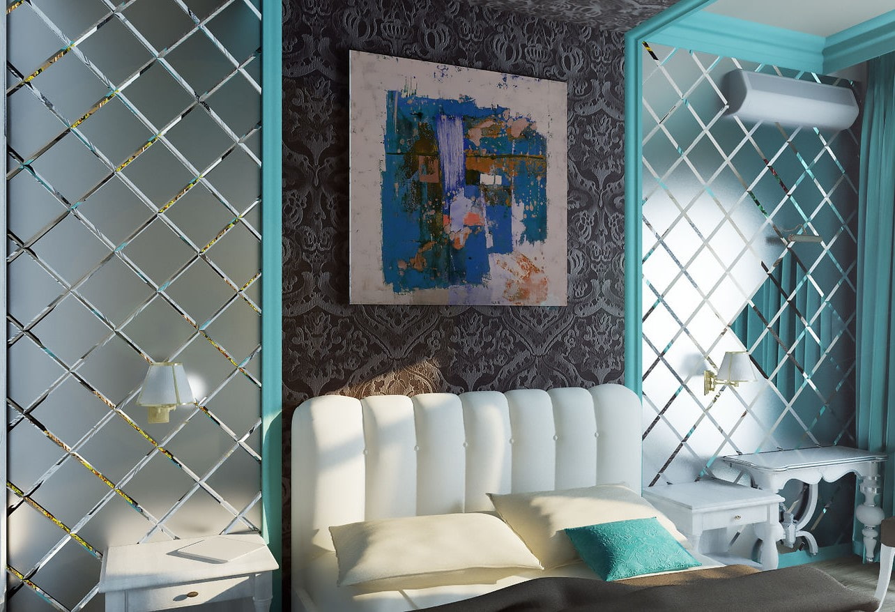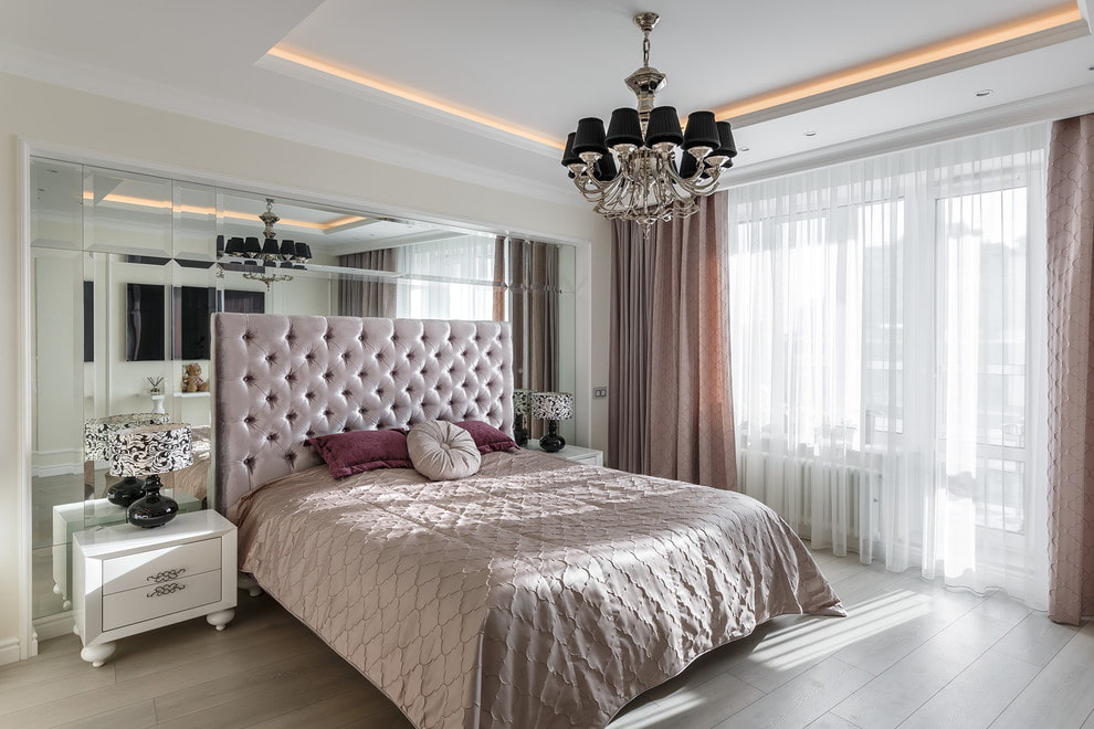 Facet mirrors located in a niche, behind the bedside tables, at the head of the bed, in the dressing room or in the boudoir area, visually transform the space and, due to the reflected light fluxes, significantly increase it.