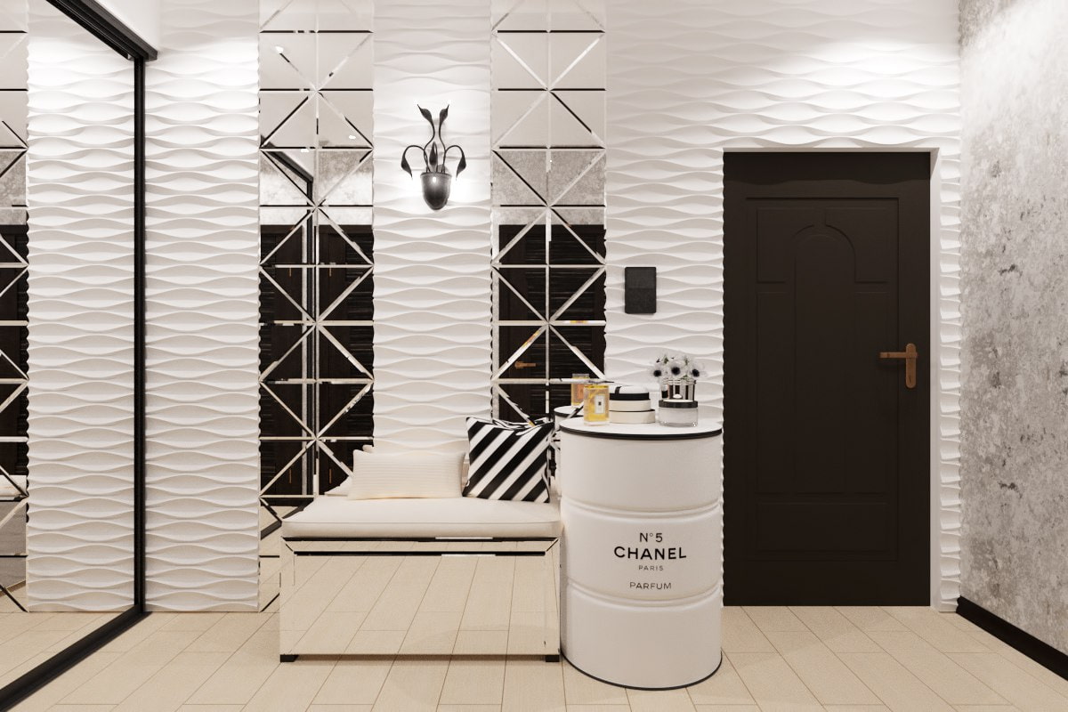 Thanks to this innovative method of processing mirror surfaces, you can completely transform the hallway space, expand its boundaries, add space, lightness, stylishness and expressiveness, and also correctly emphasize the main stylistic concept of the corridor.