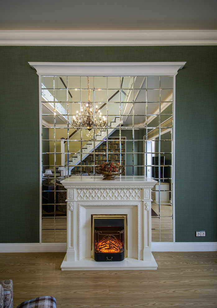 In the photo there is a wall decorated with a large mirror with a facet in the form of rhombuses.