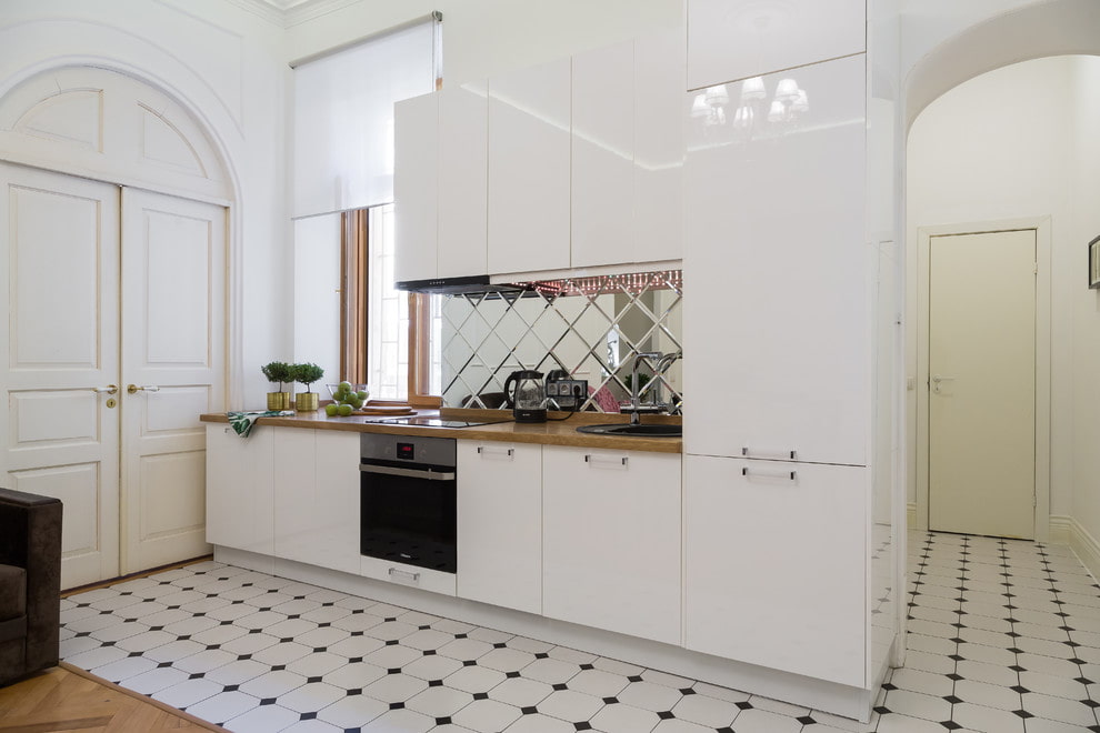 In the photo there is a spacious kitchen with a ceiling decorated with a beveled mirror.