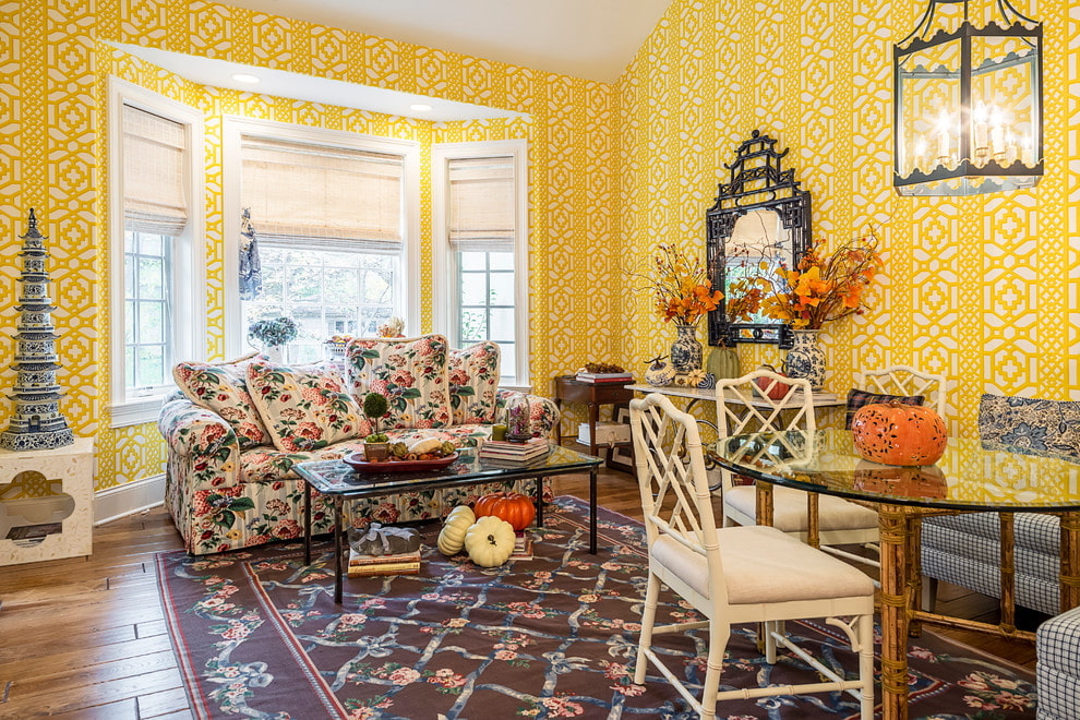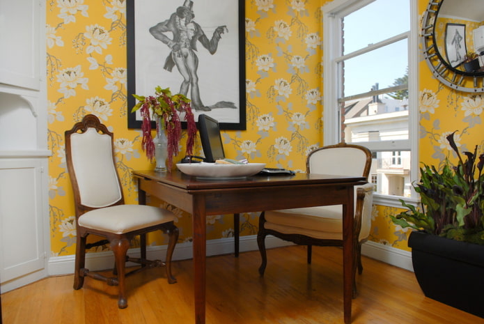 Floral patterns create a summer atmosphere in the home. Bright voluminous flowers on a yellow background can decorate any area in the apartment, for example, above the TV or bed.Light yellow wallpaper with a small discreet floral pattern can be used to trim the entire perimeter.