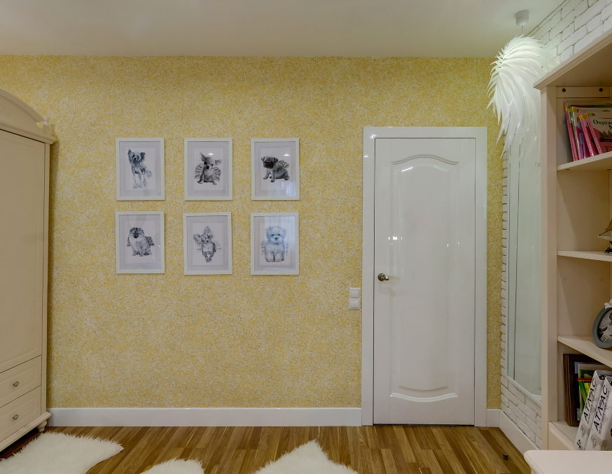 On the picture liquid wallpaper of yellow color, panels depicting dogs were used as decor.