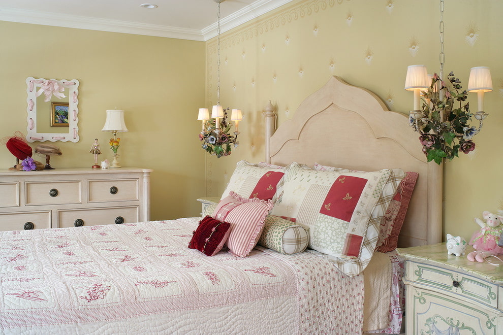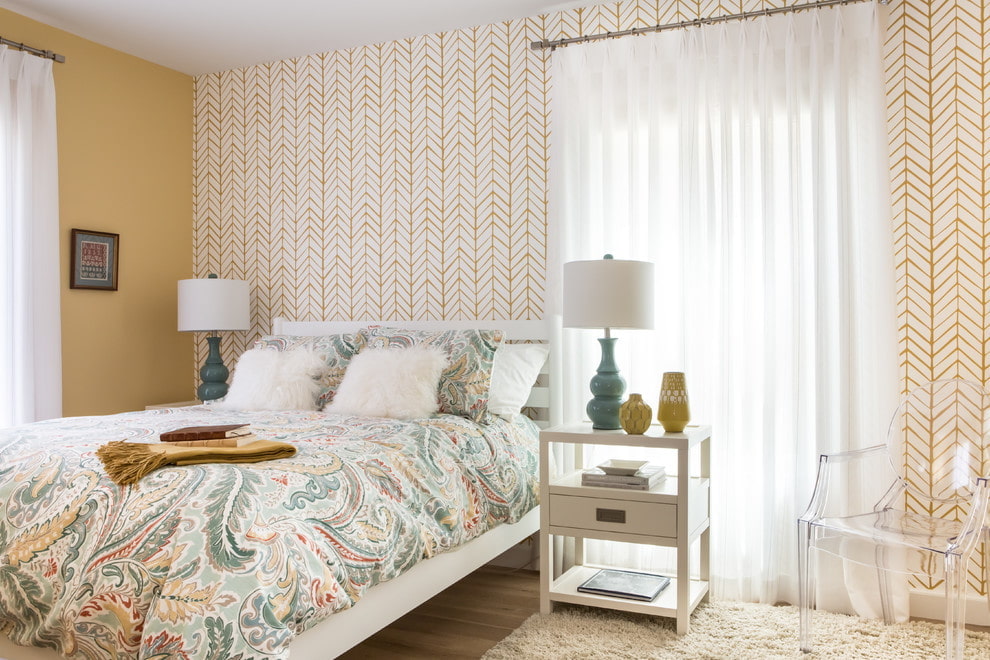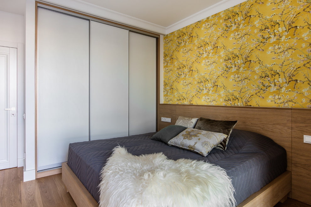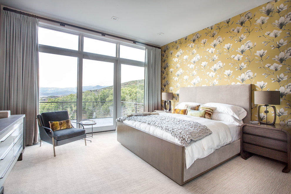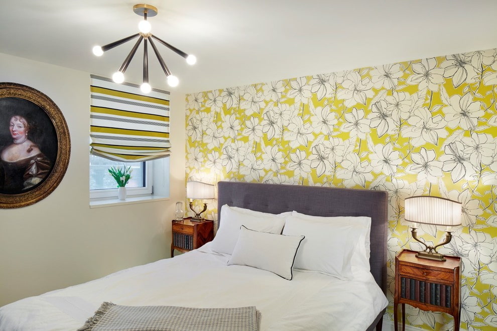 For the bedroom, it is better to choose calm light shades of yellow. A bright color can decorate one of the walls. The yellow wallpaper with the image of large flowers and floral patterns above the head of the bed looks interesting.