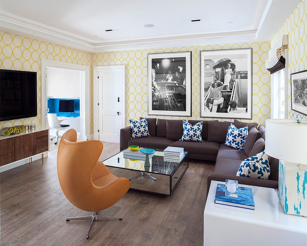 On the picture modern living room. One of the walls is decorated with yellow 3d wallpaper. In the overall picture, the interior looks stylish and laconic.