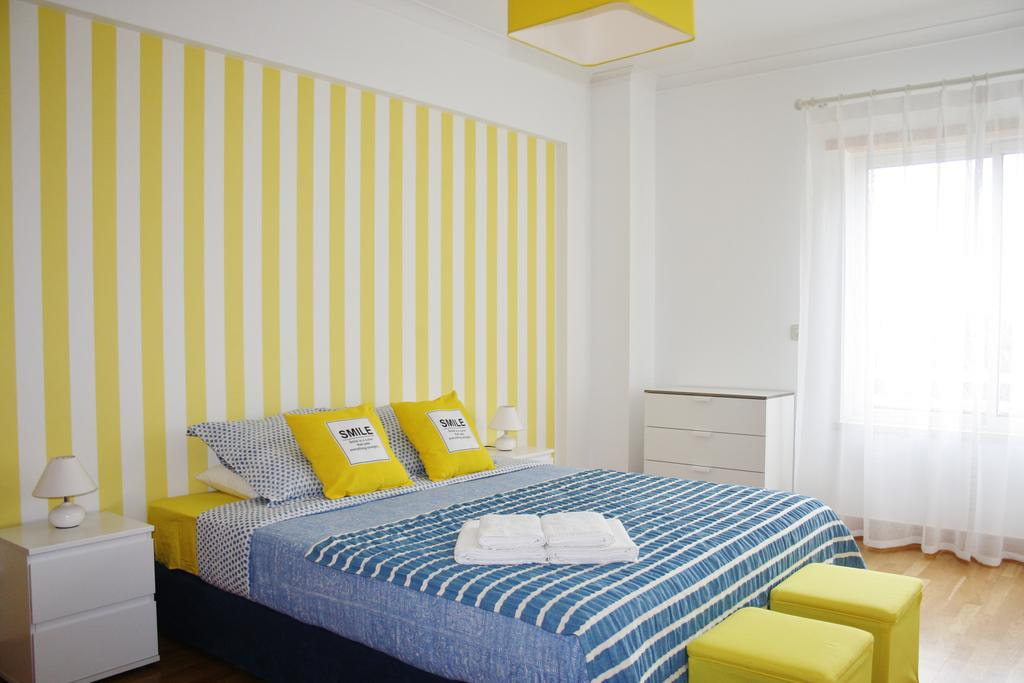 On the picture bedroom in bright yellow. White bed, curtains and decorative details balance the interior.