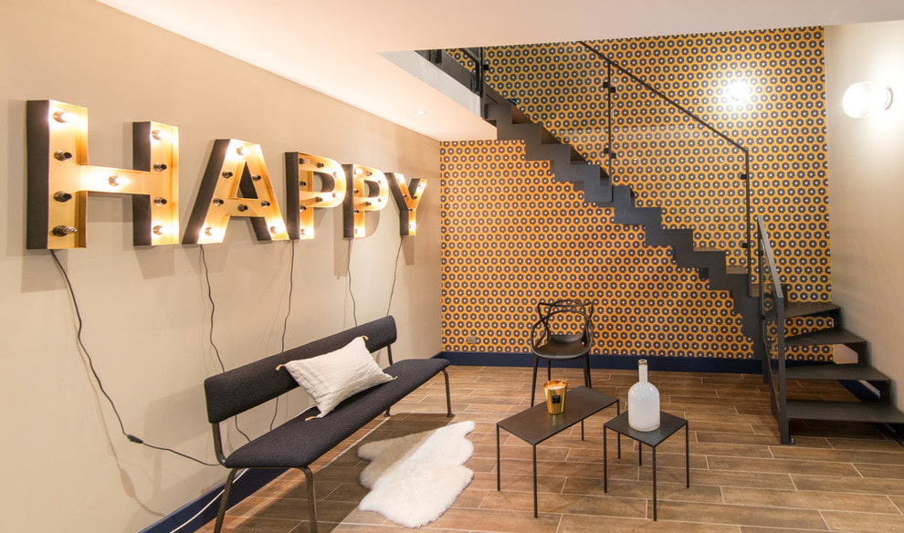 In the interior of a loft, the walls can be covered with wallpaper imitating brickwork or painted concrete. You can also combine materials, for example, the accent wall is decorated with wallpaper in yellow tones, and the rest under concrete.