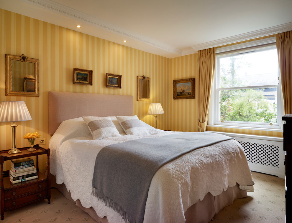 On the picture classic bedroom with yellow wallpaper. The interior is complemented by golden yellow details.