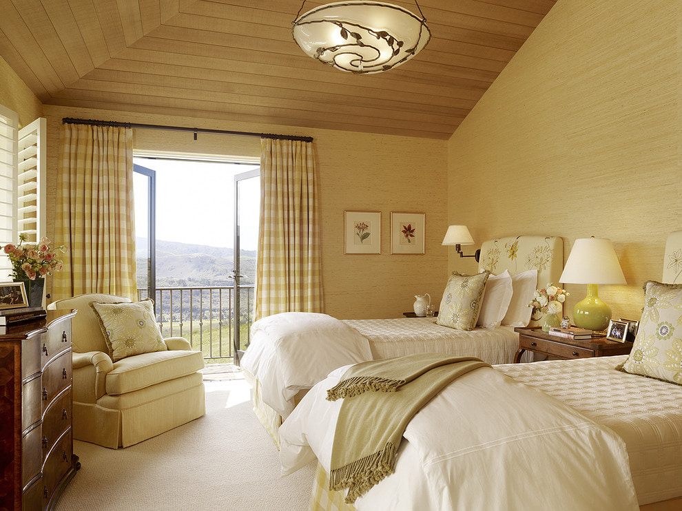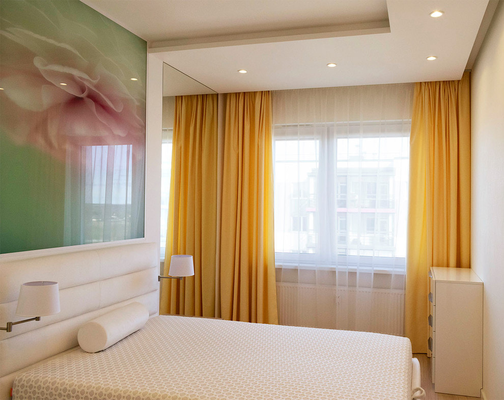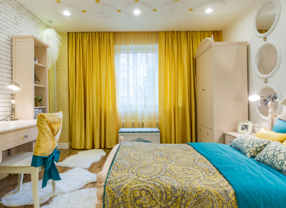 In the bedroom, it is better to combine tulle with thick curtains so that you can hide from unwanted light.Velvet and satin yellow curtains will look especially luxurious.