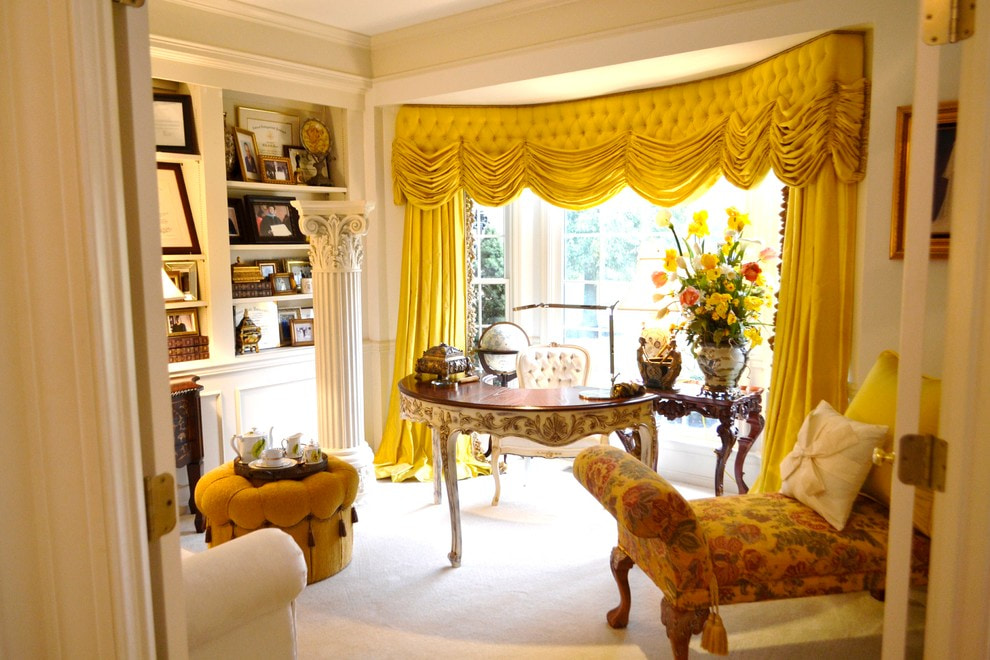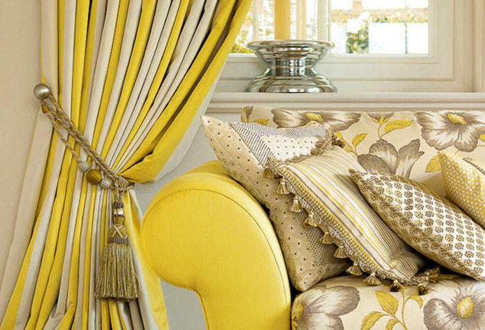 The classics are distinguished by restraint and elegance. Dirty yellow and golden shade is suitable for the living room and bedroom, pale yellow short curtains will decorate the kitchen and nursery