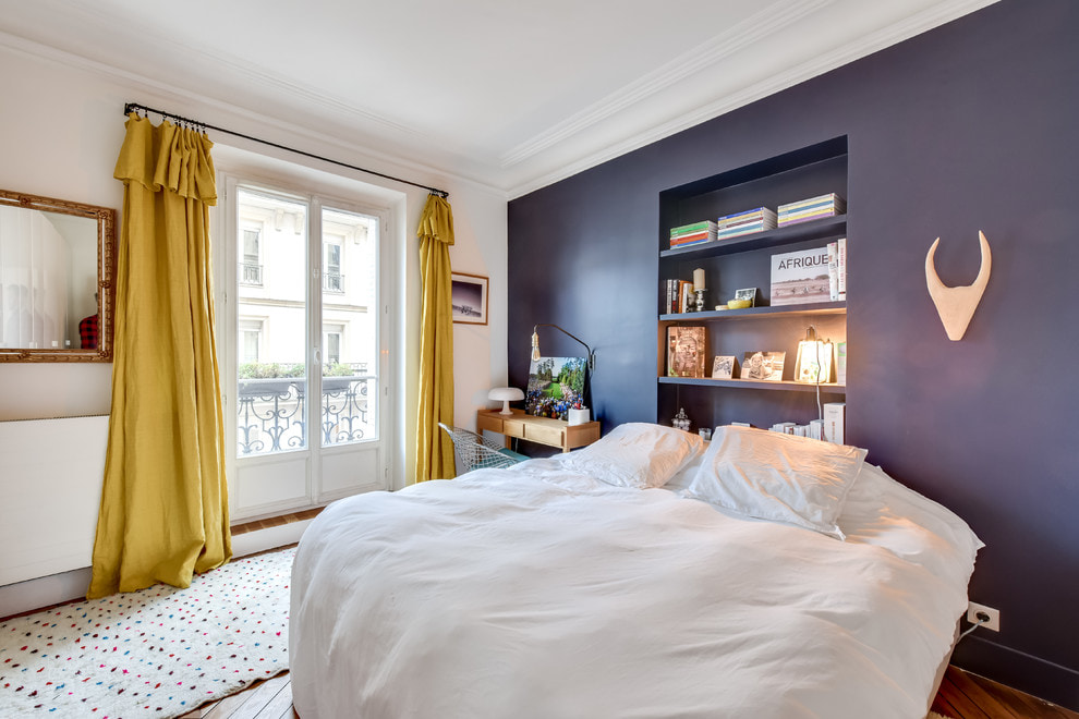 On the picture cozy bright bedroom. Yellow curtains overlap with other decorative elements.