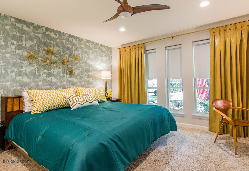 On the picture stylish bedroom in a modern style. The windows are decorated with straight creamy yellow curtains.
