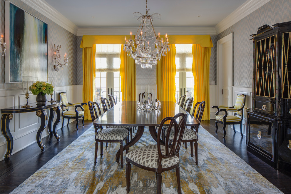 On the picture stylish dining area with saffron décor. The accent in the decoration is placed on the texture in the form of irregular wavy lines.
