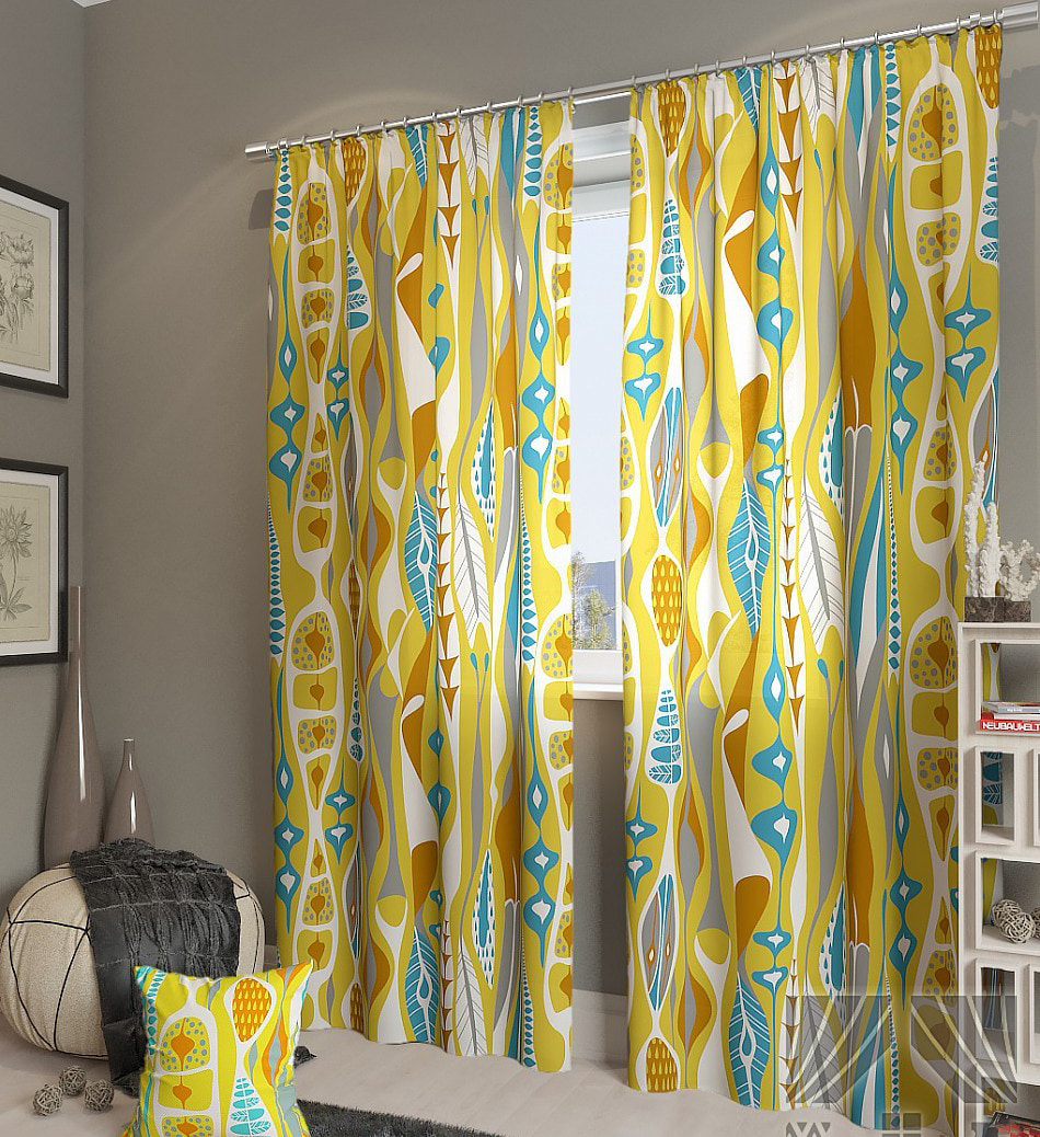 Interior wall decoration with yellow curtains is preferably done in light colors. One of the most successful background options can be considered white and gray, the room will turn out to be bright and sunny thanks to yellow curtains.