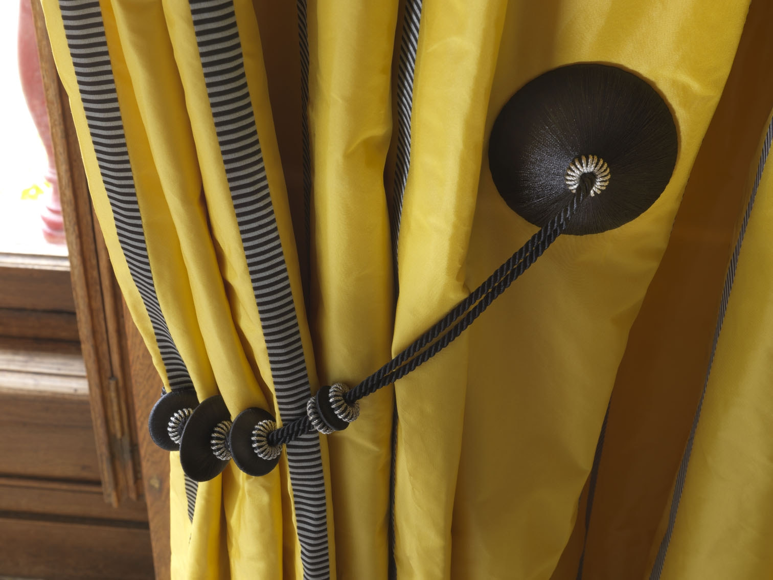 They are two magnets connected by a thin fishing line or ribbon. They hold the curtain, opening it slightly. The magnets are decorated with beads, rhinestones and stones.