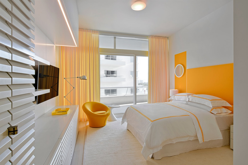 On the picture stylish bedroom in white with copper-yellow accents. The mirror insert visually enlarges the space.