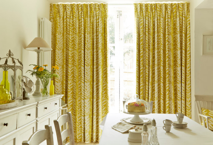 The design will be decorated with plain linen yellow curtains or curtains from a matting with an ornament. Simple straight floor-length curtains, roller blinds and roman curtains will do.