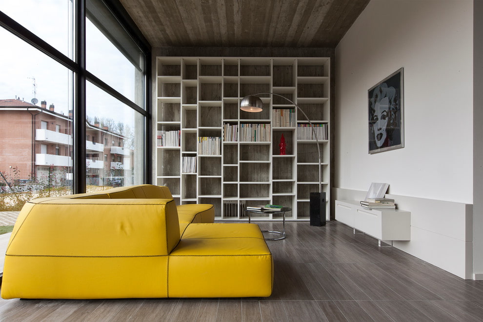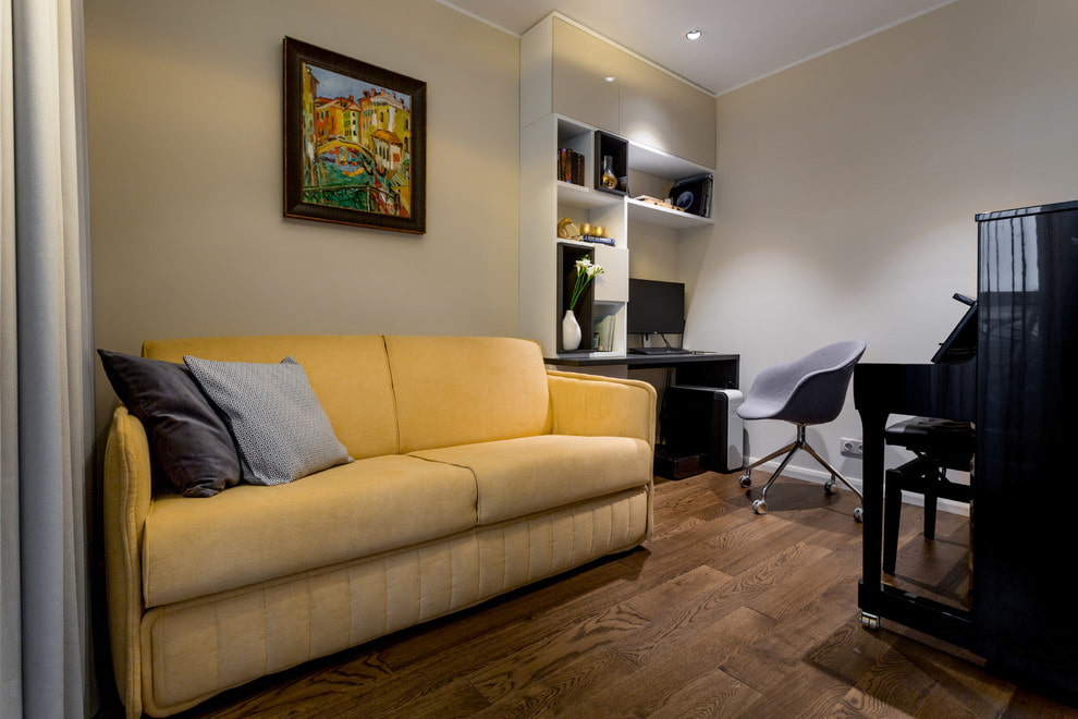 A small narrow yellow sofa, due to its diminutiveness, can easily be placed in the smallest rooms.