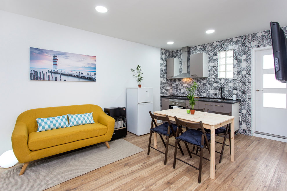 The photo shows the interior of the kitchen with a small yellow sofa.