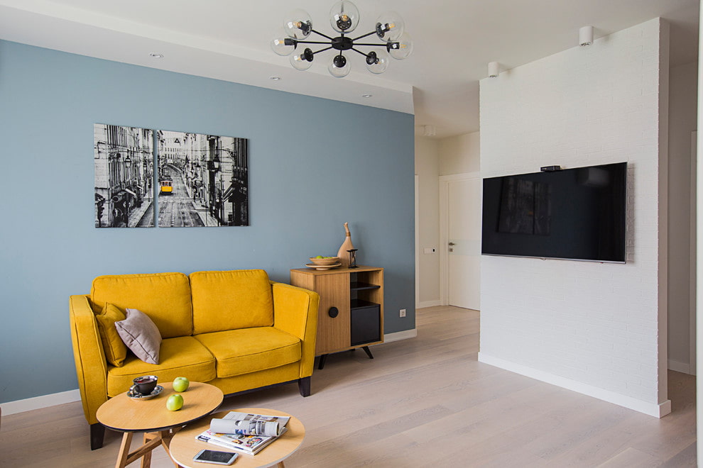 - To make the yellow sofa look more expressive and catchy, it is better to choose flooring, wallpaper or other cladding in light and pastel colors for finishing. For example, gray, white or beige walls and a dark floor will be especially appropriate.