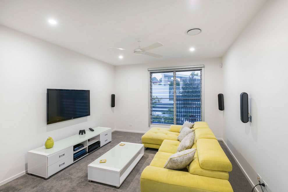 In the photo, a mustard-colored sofa combined with a gray carpet in the living room.