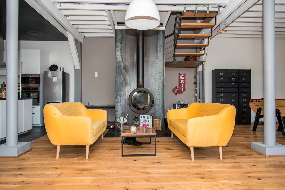 In the photo there is a loft-style kitchen-living room with compact yellow sofas on legs.