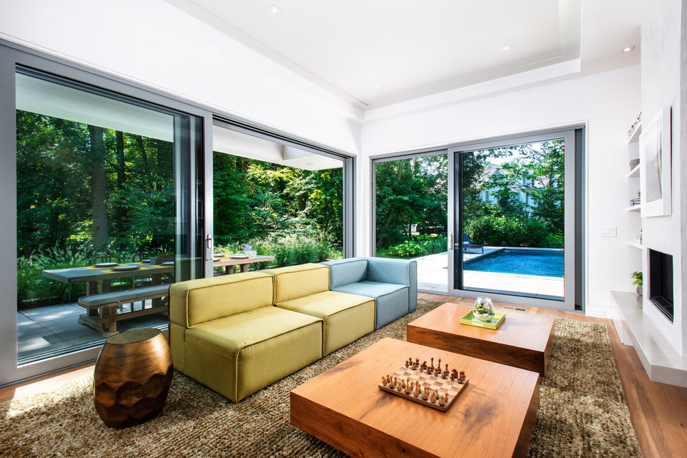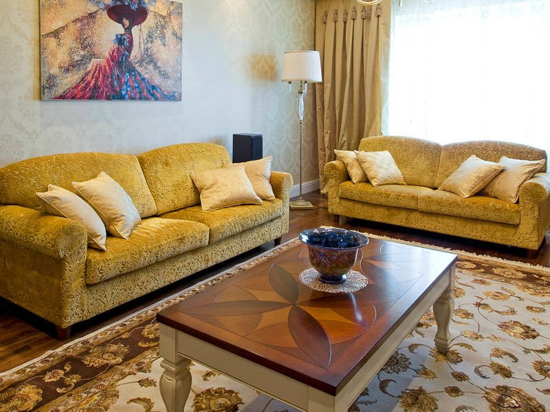 Products of a rich sunny shade look very cozy in the living room and endow the atmosphere with special comfort, and models of a pale yellow color add a special elegant solidity to the room.